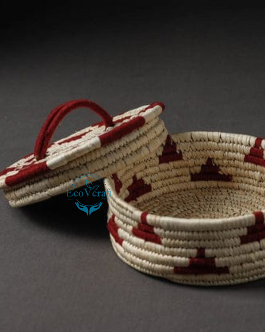 Handcrafted Sabai Grass Chapatti/Roti Box/Bread basket | Casseroles for Kitchen Dabba - Red strips & Baige