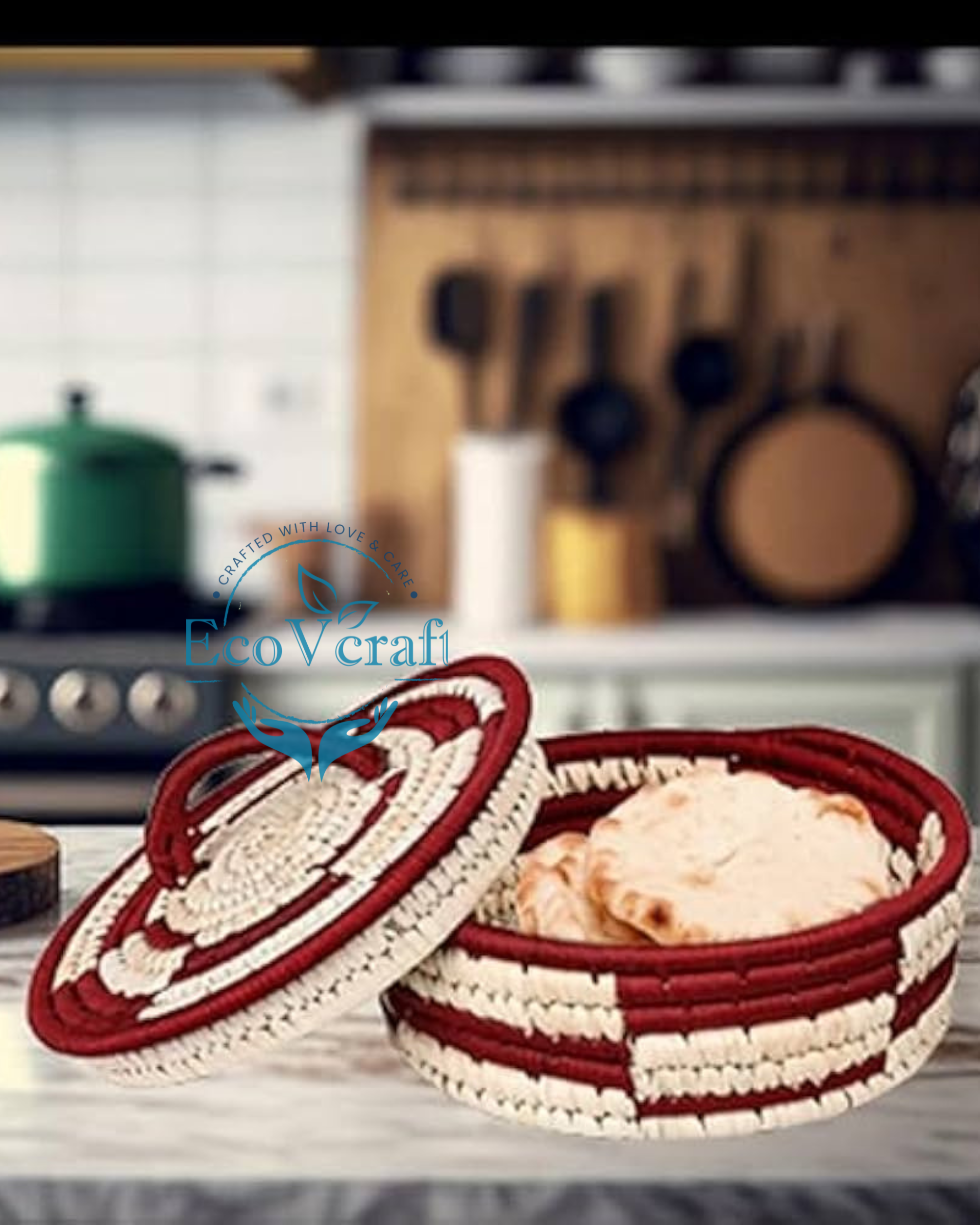 Handcrafted Sabai Grass Chapatti/Roti Box/Bread basket | Casseroles for Kitchen Dabba - Red strips & Baige